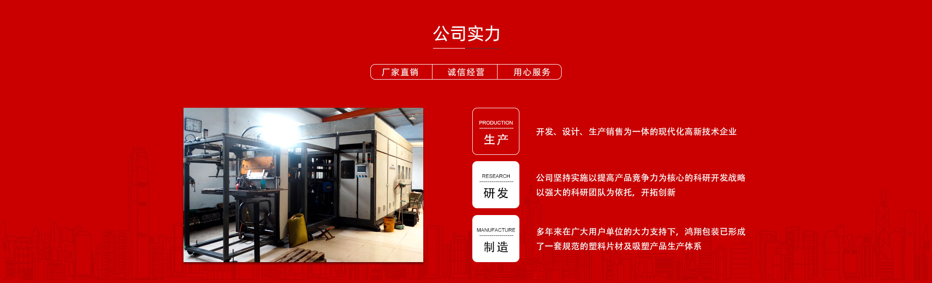 平原縣鴻翔包裝制品有限公司是一家大型生產(chǎn)塑料片材及吸塑產(chǎn)品企業(yè),本公司投資引進(jìn)電腦自動(dòng)塑料氣壓成型機(jī),壓片機(jī),全自動(dòng)高速吸塑機(jī),率先開發(fā)生產(chǎn)PVC片材,PET片材,PS片材,PP片材等,鴻翔是國內(nèi)先進(jìn)的生產(chǎn)廠家之一。本公司產(chǎn)品廣泛應(yīng)用于醫(yī)藥、食品、化妝品、日用品、農(nóng)業(yè)、五金、電子元件、工藝品等行業(yè),也可根據(jù)客戶需求自行設(shè)計(jì)制作模具。本公司技術(shù)力量雄厚,生產(chǎn)設(shè)備工藝先進(jìn)。我們秉承用戶至上的經(jīng)營宗旨,竭誠為您服務(wù)。
